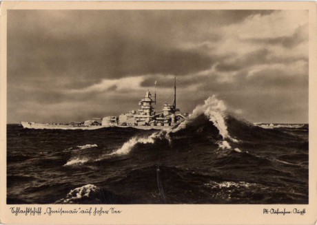 Schlachtschiff Gneisenau - bitevní křižník Gneisenau - třída Scharnhorst. Ve službě od roku 1938 do svého potopení v roce 1945. Výtlak 31.500 tun. Posádka 1669 mužů. Gneisenau byl potopen v březnu 1945 jako blok před vjezdem do přístavu Gdyně.